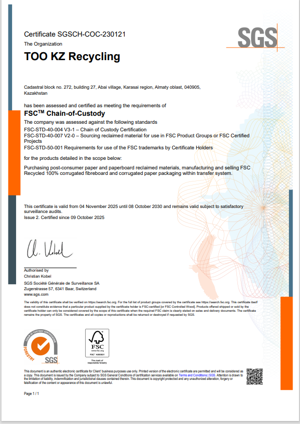 Кроме того, ТОО «KZ Recycling» обладает действующей цепочкой поставок по стандарту FSC® (Forest Stewardship Council®).